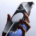 Case transparente com traseira em vidro temperado Corning e tecnologia Air-Care para proteção contra quedas e impactos. Design fino de 0,9mm mantém a estética original do iPhone.