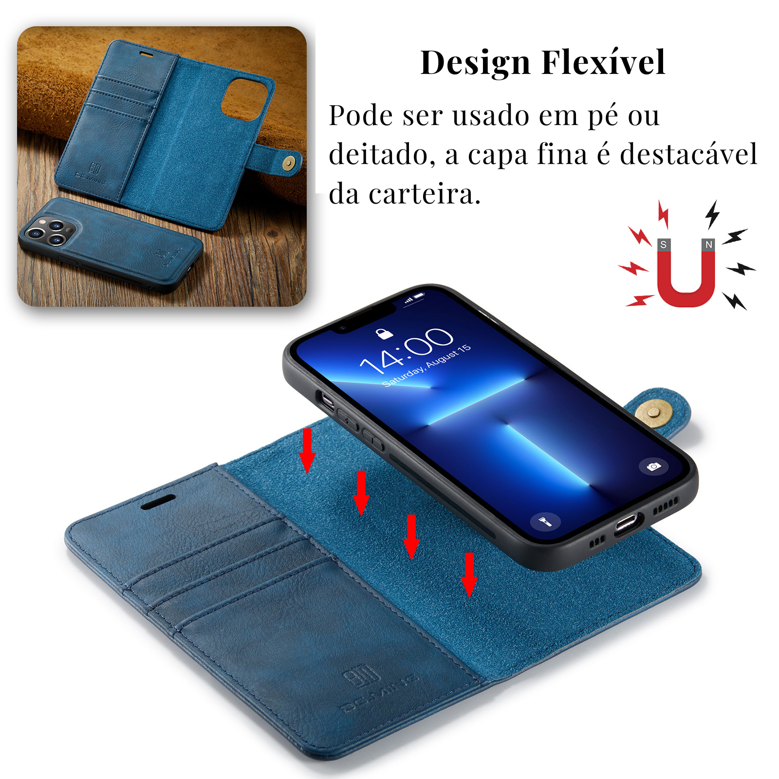 Carteira magnética remove-se facilmente da case base via sistema de ímãs integrados. Permite flexibilidade entre proteção ultrafina para uso diário e carteira completa para saídas e viagens.