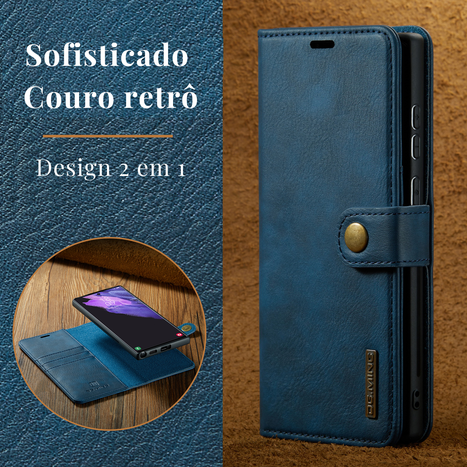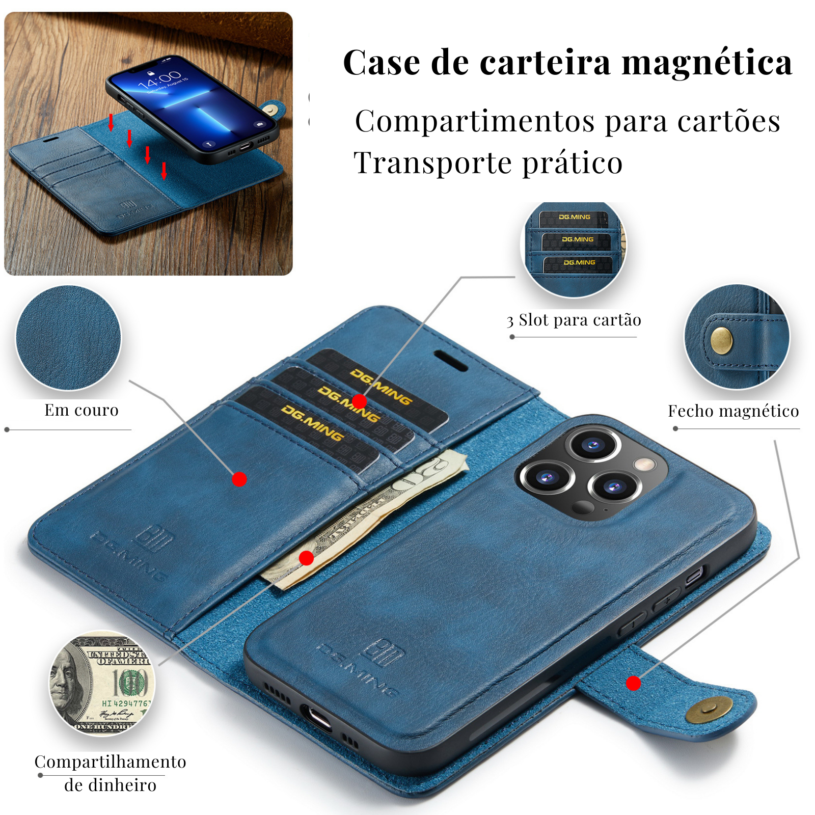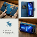 Case carteira 2 em 1 com compartimento magnético destacável. Construção em couro sintético premium com slots para cartões e dinheiro. Sistema magnético permite uso como case ultrafina ou carteira completa conforme necessidade.