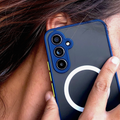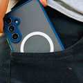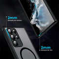 Case com acabamento fosco e anel magnético MagSafe integrado para Samsung Galaxy. Combina proteção anti-impacto com materiais TPU e PC, oferecendo carregamento sem fio e compatibilidade com acessórios magnéticos.