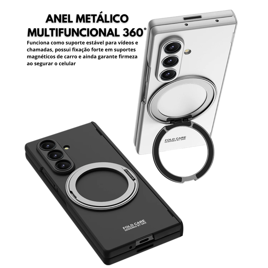 Recursos: Anel giratório 360°, suporte integrado, película HD frontal inclusa, proteção total da dobradiça
