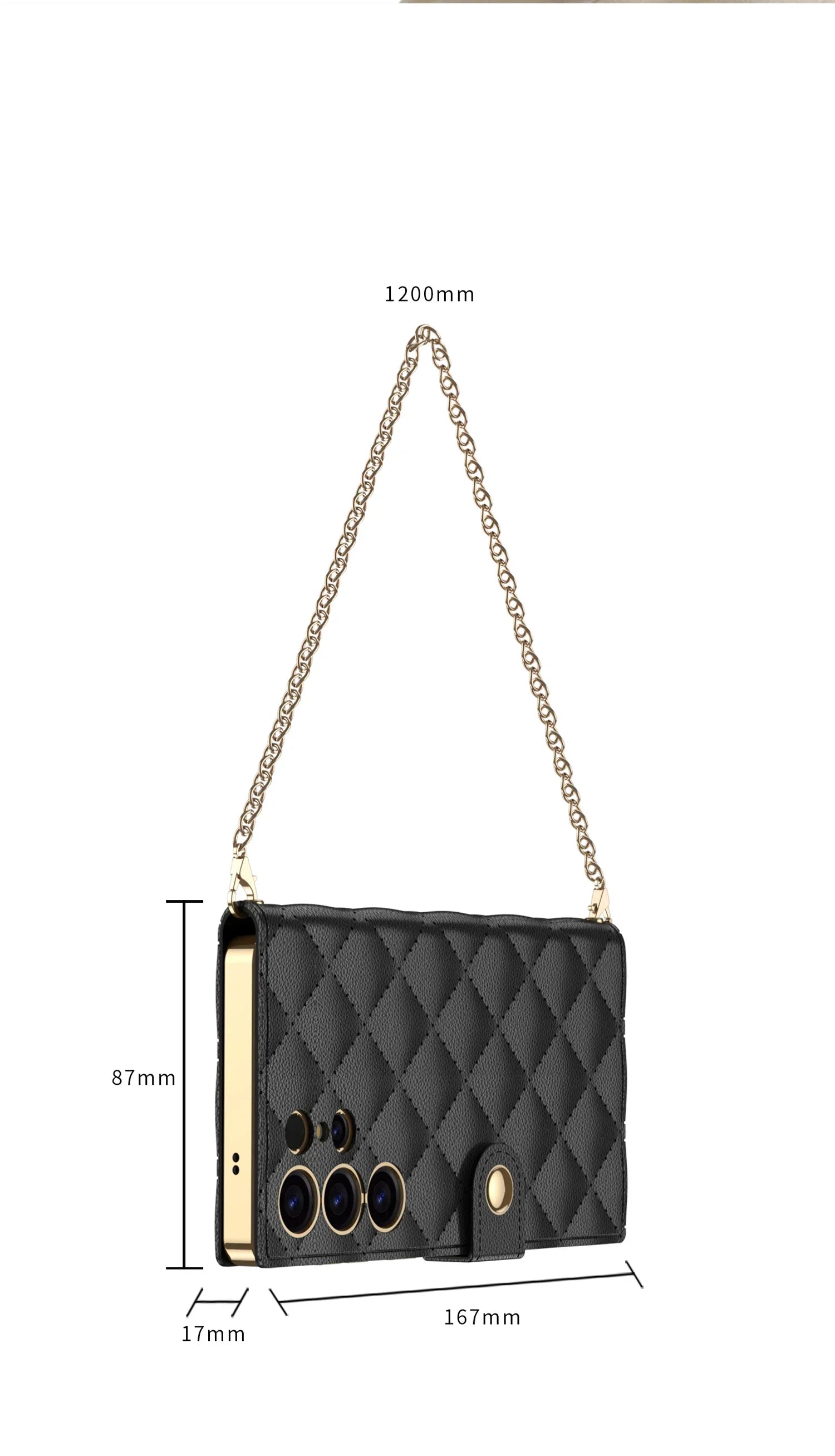 - Características: Porta-cartões, espelho interno, função de suporte, alça de mão dourada, fecho magnético, laterais com acabamento cromado, proteção contra impactos.