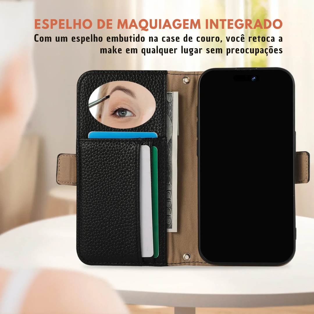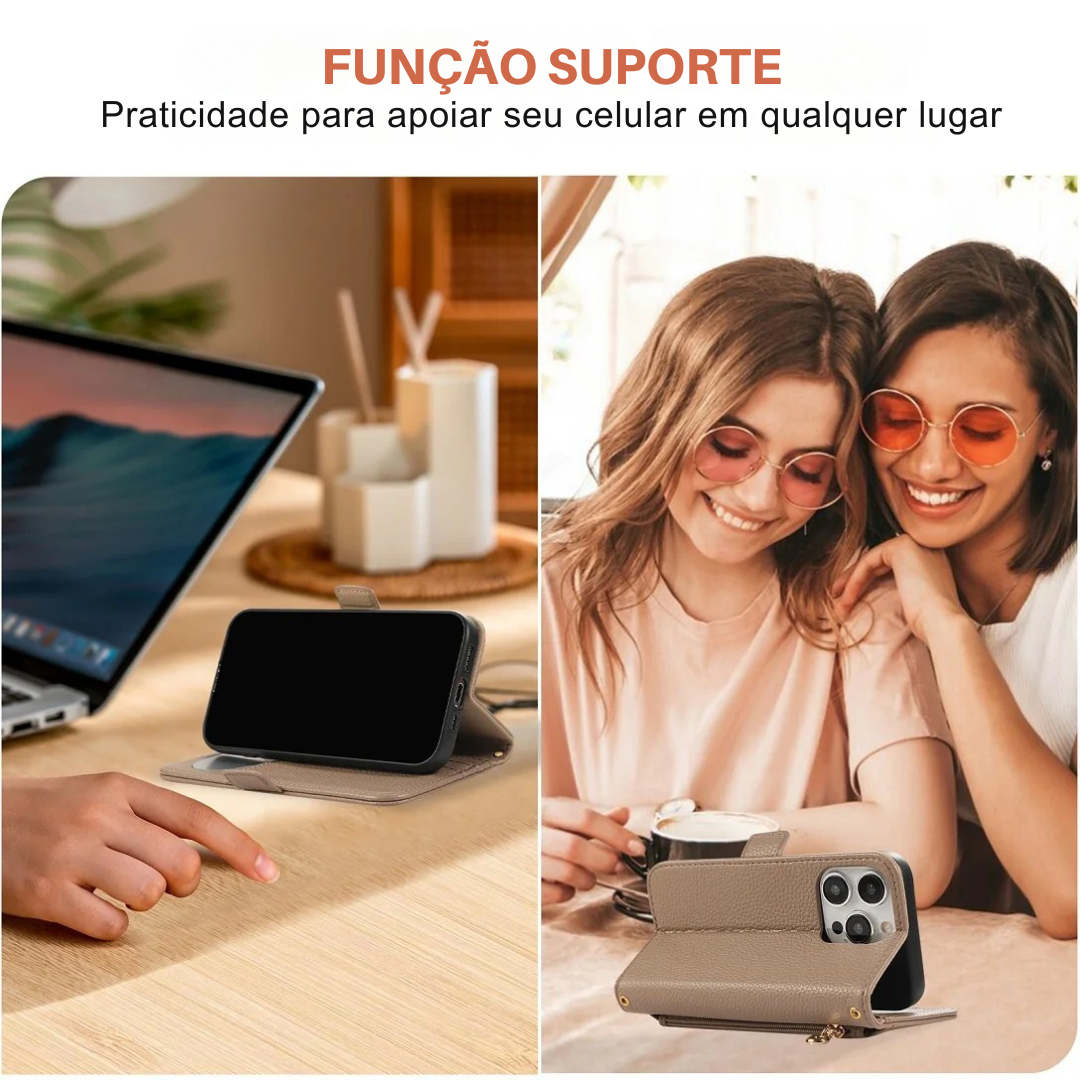A solução que une praticidade, proteção e um visual sofisticado para quem não abre mão de conveniência no dia a dia. Muito além de uma simples capa, ela organiza seus itens essenciais e mantém seu iPhone seguro em qualquer situação.