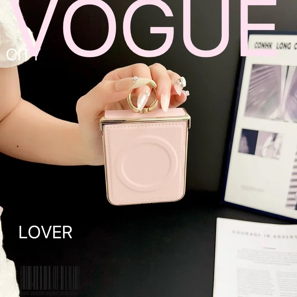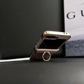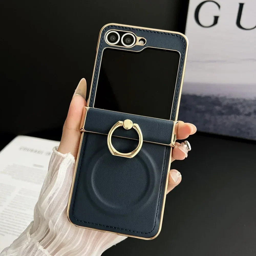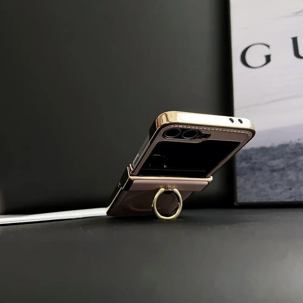 A case é revestida em courino de alta qualidade com uma textura suave, que é antiderrapante e resistente a impressões digitais. As laterais com acabamento cromado (eletroplating) adicionam um brilho sofisticado que eleva o visual do seu Z Flip, criando um contraste elegante e moderno.